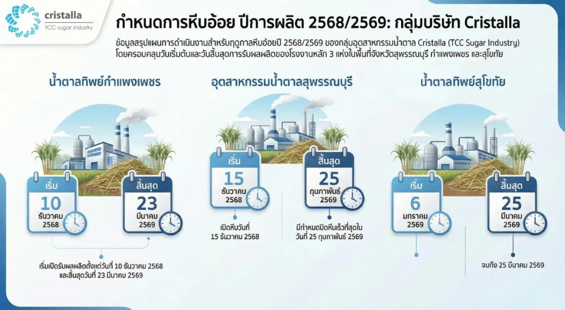 กลุ่มบริษัท Cristalla (TCC Sugar Industry) ขอแจ้งให้ทราบว่า ขณะนี้การดำเนินงานรับผลผลิตอ้อยประจำฤดูกาลหีบอ้อย ปีการผลิต 2568/2569 ของโรงงานหลักทั้ง 3 แห่งในกลุ่มบริษัทฯ ได้ดำเนินการเสร็จสิ้นและ "ปิดหีบ" อย่างเป็นทางการในทุกพื้นที่แล้ว ตามกำหนดการดำเนินงานที่ผ่านมา ดังนี้: